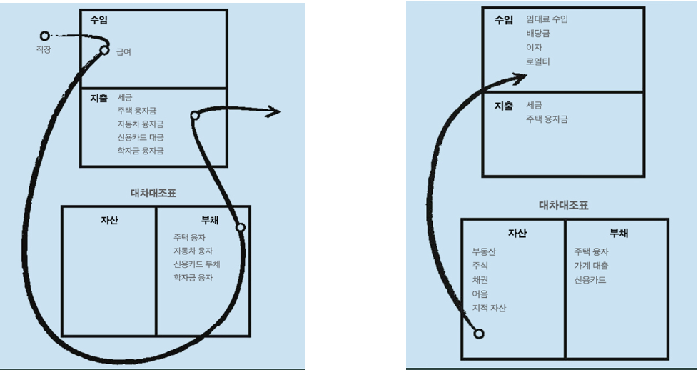 가난한 사람들의 현금 흐름(왼쪽)은 수입이 생기면 이를 통해 부채를 사들이고, 다시 부채가 일으키는 지출로 인해 돈이 쌓이지 않게 됨을 보여줍니다. 여기서 부채는 우리가 사고 싶은 것들(?)이라고 생각하면 될 것 같습니다. 예를들면 자동차, 집이죠. 구입할때 대부분의 사람들이 빚을 끼고 사기도하고, 이러한 재화들은 계속해서 지출을 발생시키니까 이렇게 표현한 것 같습니다.