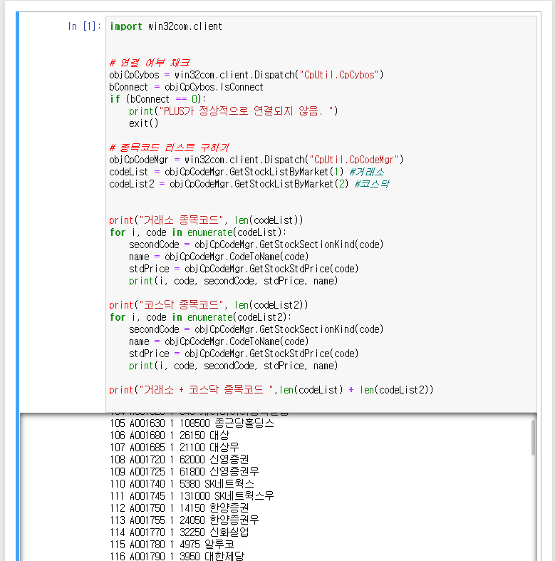 코스피와 코스닥 종목들이 모두 출력되고, 총 종목 수가 출력되는 것을 확인할 수 있습니다.